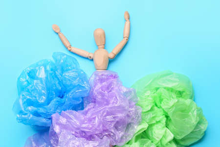 Wooden mannequin with garbage bags on color background. Ecology concept