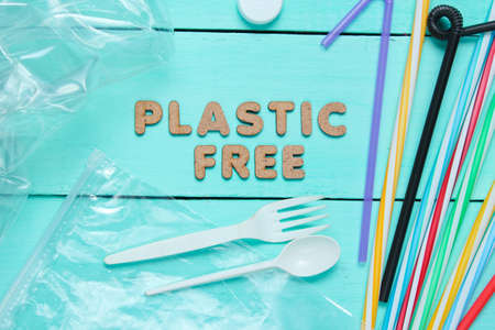 Plastic free concept. Many cocktail tubes, plastic spoon, fork, bag, bottle on blue wooden background with text plastic free