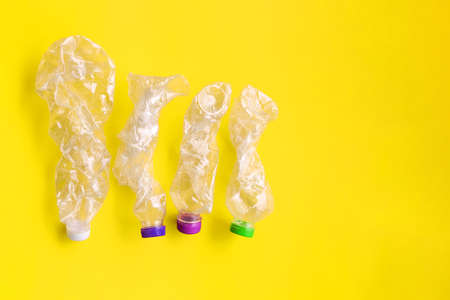 Used rumpled plastic bottles on yellow background. Ecology problem. Top view, copy space.