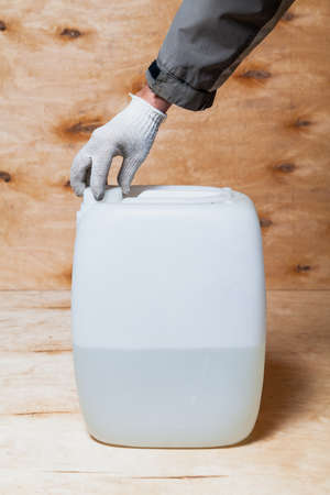 hand in a white glove unscrews the lid on a white plastic canister against a background of light plywood. The container is filled with liquid