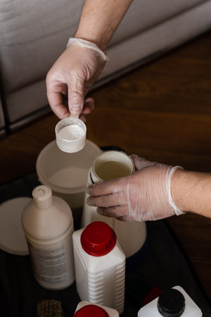 Human hand in protective glove holding a yellow bleach bottle. Disinfection concept