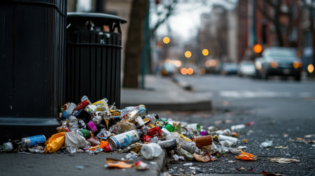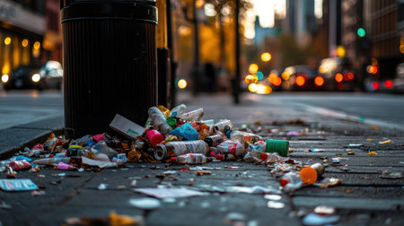Overflowing urban trash bin with foil and plastic wrappers littering the sidewalk