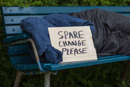 Homeless man on a park bench with a carboard sign