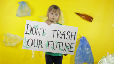 Child girl activist in green t-shirt with recycle logo holds encouraging protesting poster Dont Trash Our Future. Background with cellophane bags, bottles. Save environment. Plastic nature pollution