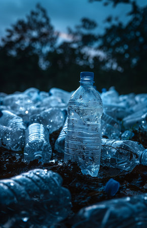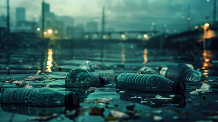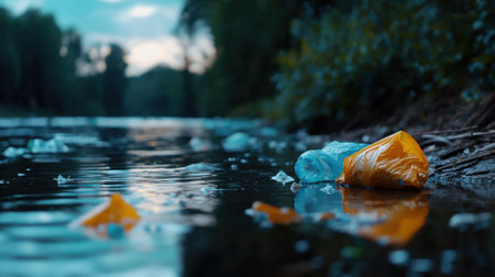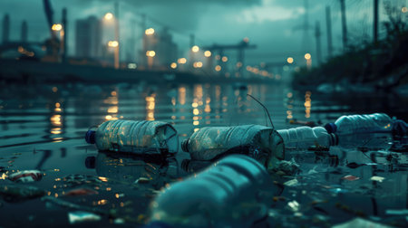 A river with plastic bottles floating in it. Scene is sad and concerning, as it shows the negative impact of pollution on the environment