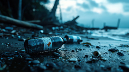 A bottle of water is on the beach next to a pile of trash. The bottle is wet and has a label that says fragile. The scene is a reminder of the importance of reducing waste