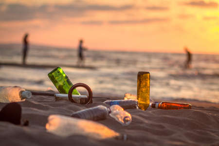 Plastic bottles and glass on the beach at sunset. Pollution concept