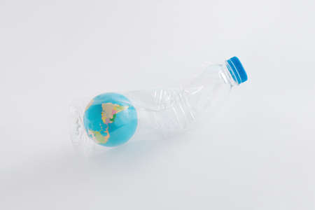 Globe trapped in a crumpled plastic bottle on a pastel white isolated background. The dystopian future of planet Earth. Minimal creative ecological concept of global nature pollution. Save the World.
