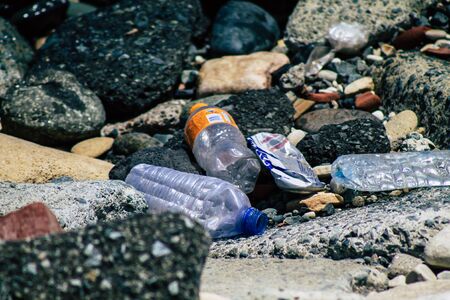 Limassol Cyprus June 12, 2020 Closeup of various pollution of metallic and plastic waste found on one of the natural beaches near the town of Limassol in Cyprus