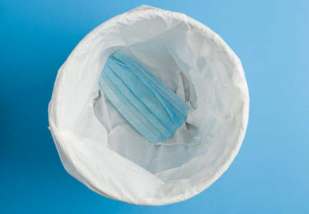 covid-19 prevention concept, garbage can with white bag and mask in the background, blue background color