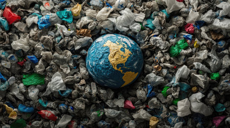 A striking image of the Earth surrounded by plastic waste highlights the urgent need for environmental awareness and sustainable practices.