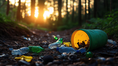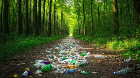 A scenic forest pathway cluttered with discarded plastic bottles and waste, illustrating the pressing issue of environmental pollution and the need for conservation.