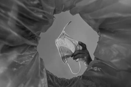 Throwing a face mask into the trash. With a view from the inside of the trash bin.Post pandemic trash.