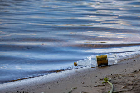Moscow, Russia - July 21, 2022: empty plastic bottle lying on the shore. high quality photo