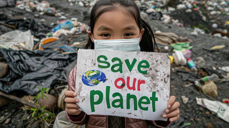 A child in yellow and white mask holds up the sign save our planet against a background of garbage piles, plastic waste, garages, and old cars with a foggy sky