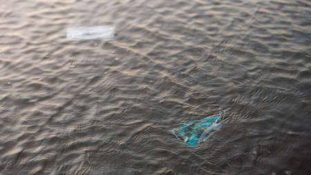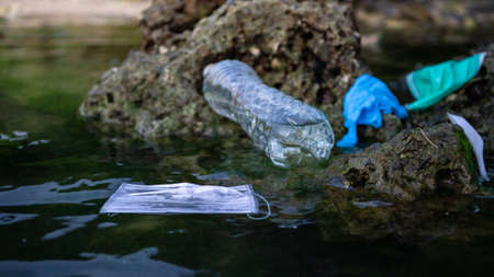 Coronavirus polluting the environment. The waves wash up old used medical mask waste, plastic bottle and gloves. Protective equipment get into the water, they pose a threat to marine life.