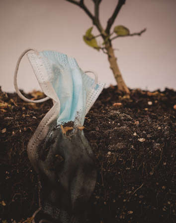 Used medical mask in the ground. Post-pandemic garbage.Soil contamination.