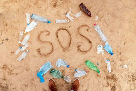 Person stand on a sandy beach, close up of shoes. Frame from plastic dirty bottles with text SOS. top view. The concept of environmental protection and Earth Day.
