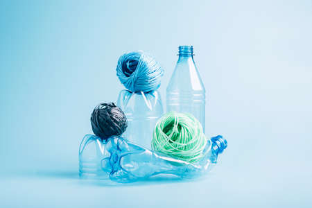 Plastic recycling and reuse concept. Empty plastic bottle and polyester fiber synthetic thread on a blue background.