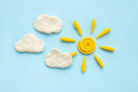 Weather forecast concept with plasticine sun and clouds, top view