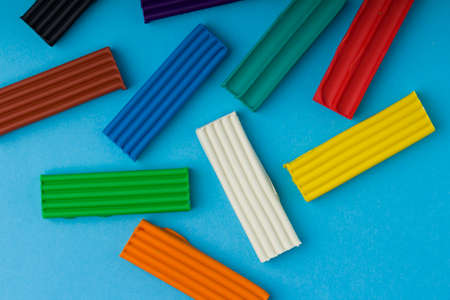 Set of colorful plasticine sticks on blue background.