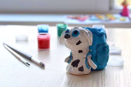 Paintbrush and handmade dog figure from clay pottery. Supporting creativity, learning by doing, DIY project, hand craft. Concept of education and development of gifted children
