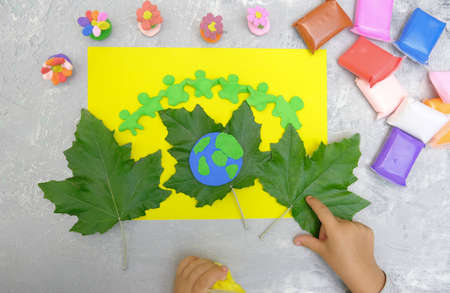 Child created Earth planet from plasticine and card from paper and natural leaves. Protection of environment, Save our planet. Ecology concept. Concept of art learning and education
