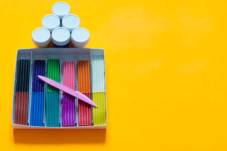 There are jars of gouache above the plasticine box, yellow background