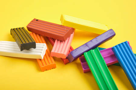 Close-up plasticine of different colors lies on a yellow background with copy space. White, red, yellow, blue, green, black plasticine for children. Children's creativity. Preparation for school. Plasticine modeling.