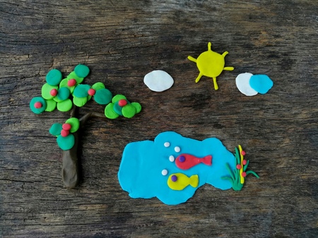 Plasticine clay made are fish in pond and tree on wooden background,natural dough