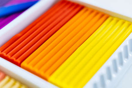 red, orange, yellow plasticine. stationery store for schoolchildren.