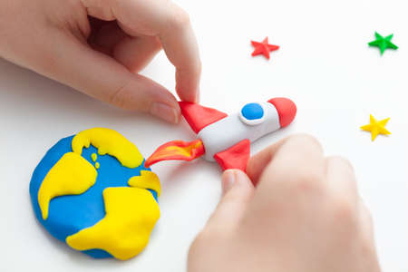 A young boy playing with a space rocket that is blasting off from the planet Earth to the stars. The space rocket and the planet Earth are made out of polymer clay. Shallow depth of field.