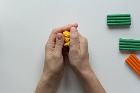Woman hands making soften and warm piece of polymer clay on the white background