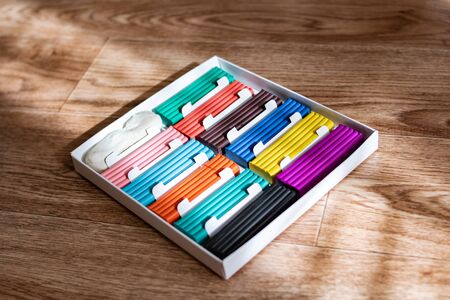 large box with multi-colored plasticine. stationery store for schoolchildren.