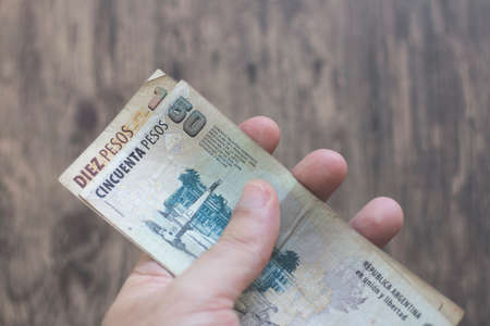 Hand holding Argentinian Money Banknotes. Argentine Money.