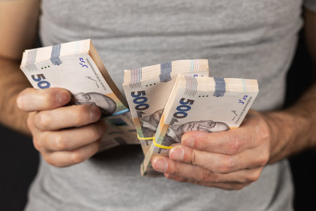 Man holding Ukrainian money 500 hryvnia banknotes. closeup