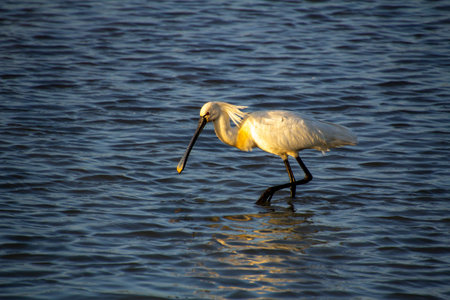 Royal Spoonbill or Platalea regia feeding in shallows as sun sets on Tauranga Harbour