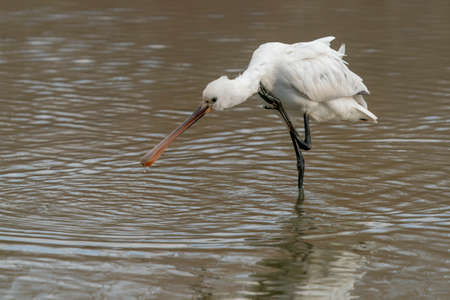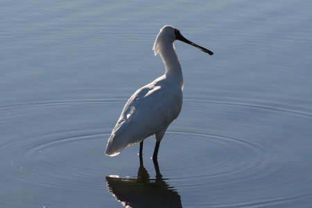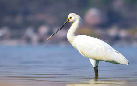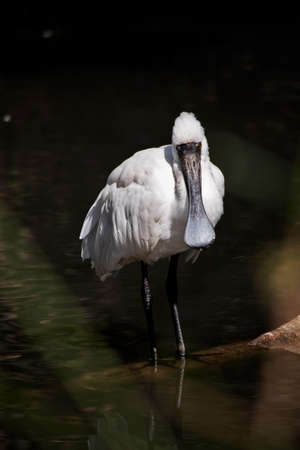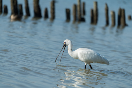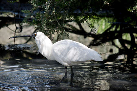 A white colored spoonbill bird is in the water. Spoonbills are a genus Platalea of large long legged wading birds