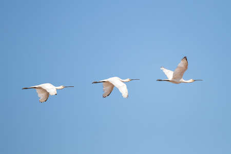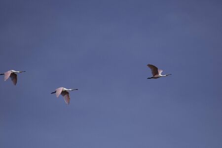 Three Eurasian spoonbill (Platalea leucorodia) in flight in the natural area Marismas de Odiel, Huelva, Andalusia, Spain