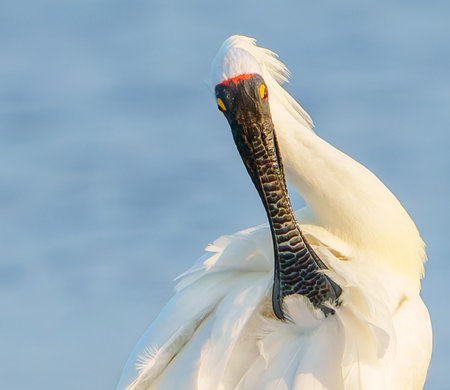The yellow spoonbill is a large white sea bird with a cream bill that looks like a spoon. The yellow spoonbill has a thin blue line around its face with light blue eyes