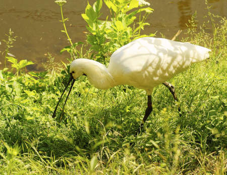 White Eurasian Spoonbill Platalea leucorodia in the pond in beautiful sunlight.