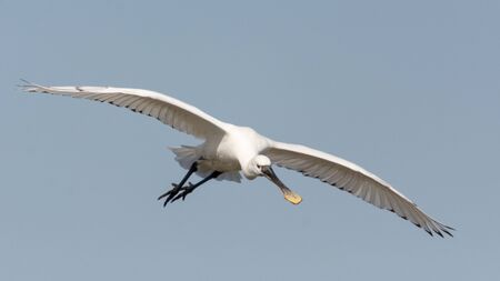 Eurasian spoonbill (Platalea leucorodia) in flight at Marismas del Odiel, Huelva, Andalusia, Spain
