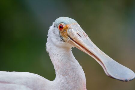 Portrait of roseate spoonbill. One isolated Platalea ajaja with green backgrounds.