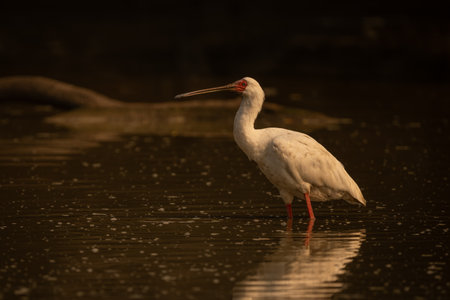 African spoonbill in calm pond near log