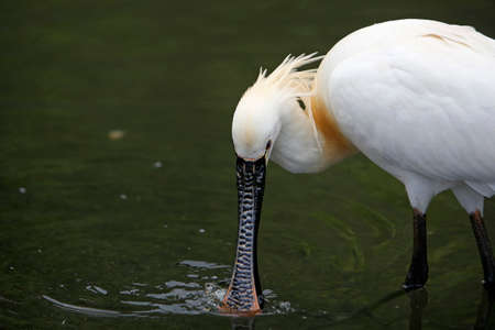Closeup of a common spoonbill, Platalea leucorodia, foraging in water