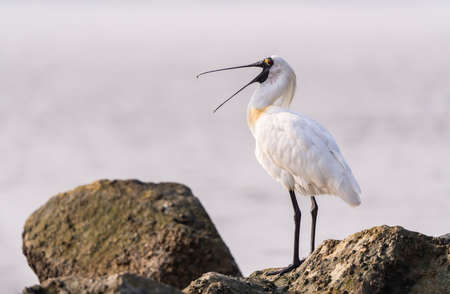 Black-faced Spoonbill in shenzhen China, This species is known as a winter migrant in China. IUCN is now listed this species as an Endangered (EN) bird (Current IUCN Red List category).