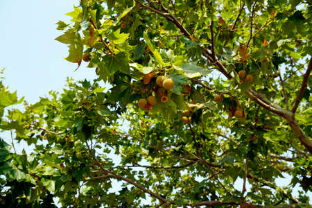 Green Leaves and futis of Pltatanus oreintalis tree in sunset light. Platanus orientalis, the Old World sycamore or Oriental plane.