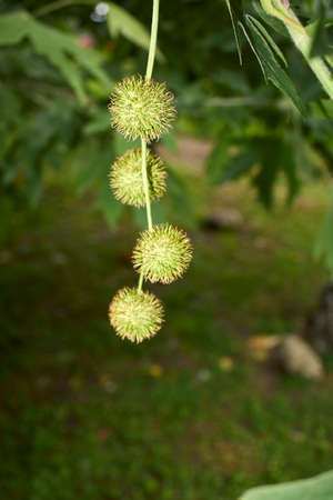 Spiky Chestnut Ball. Platan leaves with fruits close-up .