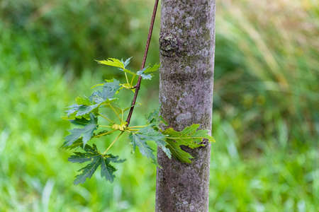 Small sprout on maple trunk, close up shot