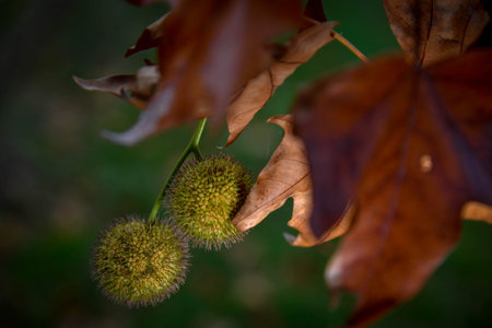 Detailed view of spiky spherical seed pods of a plane tree (Platanus) hanging from a branch surrounded by autumn foliage in shades of green and brown, symbolizing seasonal change and renewal.